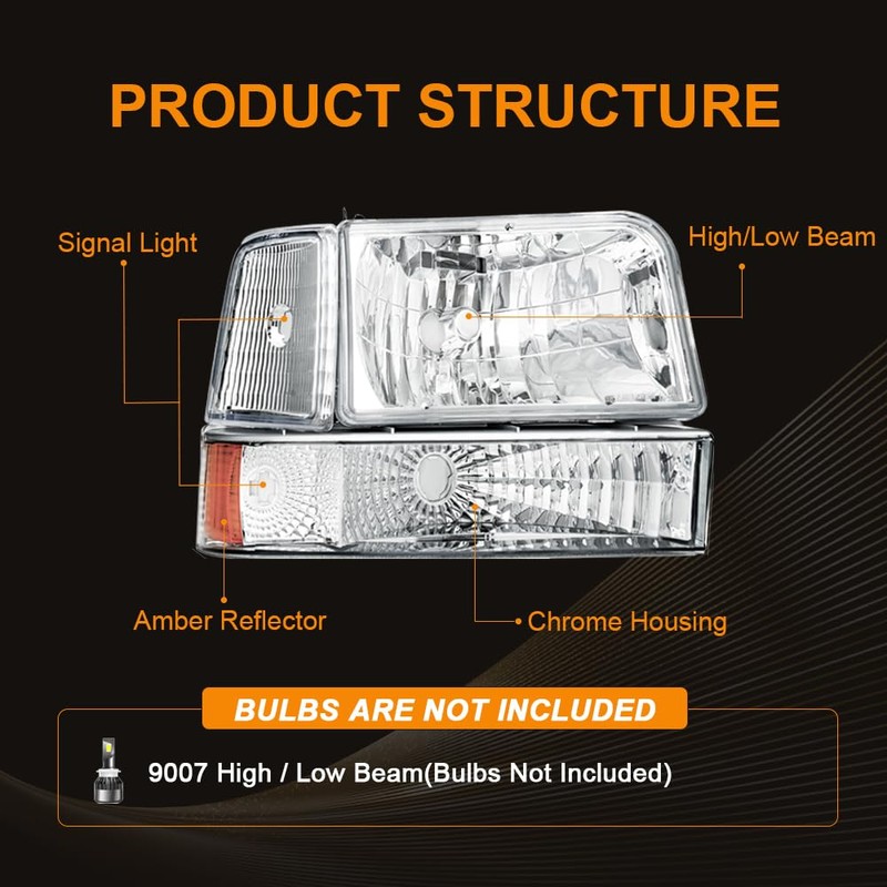 - VEHICLE FITMENT: The headlights are Compatible with 1992-1996 Ford F150 F250 F350/1992-1996 Bronco; 9007 High/Low Beam; Bulbs NOT included; Reference/OEM Part Number: F2TZ13008A/F2TZ13008B.