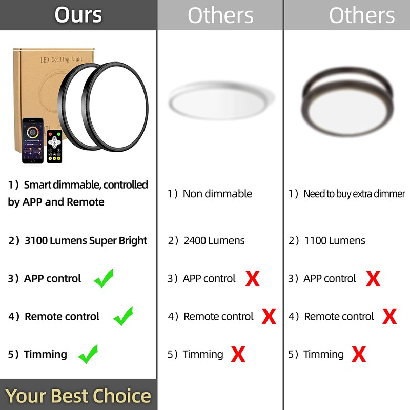 - 【MORE BRIGHTER & DIMMABLE】 –High quality 2835 LED inside the ceiling light ,total 176pcs high quality led chip produce 110 lumens per watt, up to 3100 lumens(28W). “CRI >80” which will make your bedroom or living room looks very good and bright. The light can be dimming by APP and remote(NOTED: 1.1.POINT THE REMOTE LAUCH LIGHT STRAIGHTLY at CEILING LIGHT. 2.IT IS NOT COMPATIBLE WITH OTHER REMOTES) , you can set any brightness you want. NOTE: This Ceiling Lights is not BATTARY Operated.