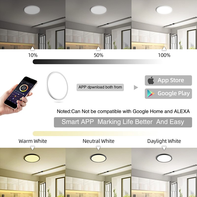 - 【NEW VERSION!-- APP Control with Remote】 The new version have a big improvement based on normal light ,this ceiling light control the light via “APP” and “Remote control” , No longer need to get up to turn off the light ! With the APP and Remote, light can be adjustable from Warm white to Cold white ; brightness from 10%-100%. Please kindly NOTE: APP CAN ONLY CONTROL THE LIGHT IN THE HOUSE. This LED Ceiling lights can be used separately