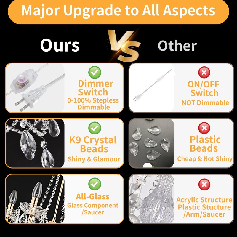- 【K9 Crystal & Glamour Everywhere】All the beads on the chandelier are all K9 crystals, they are plastic arcylic ones available. They may look similar in pics but they can't be more different, the K9 crystal will reflect an incredible jewelry-like glamour. Acrylic plastic will have a significant yellowing effect with even one year of use, whereas glass will still look fabulous in years to come.