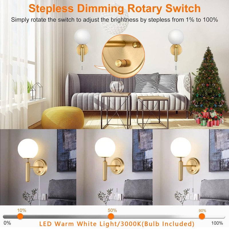 - 【Unique Design】features with opal globe glass lampshade which inlaid brass metal, the plug in wall sconces is unique and beautiful shape, this glamorous wall light fixtures is an good ideal for home lighting decoration