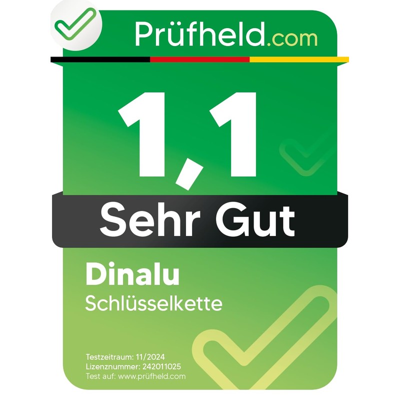 - Test very good, note 1.1: The "Dinalu" key chain has been rigorously tested and received the top grade "1.1 very good" from Prüfheld.com in the test period 11/2024 (licence number 242011025). Trust in the proven quality of a product that has been highly rated in stability, functionality, sustainability and appearance. Our products pass every odour test and feel test, they smell neutral and are a real worry flatterer.