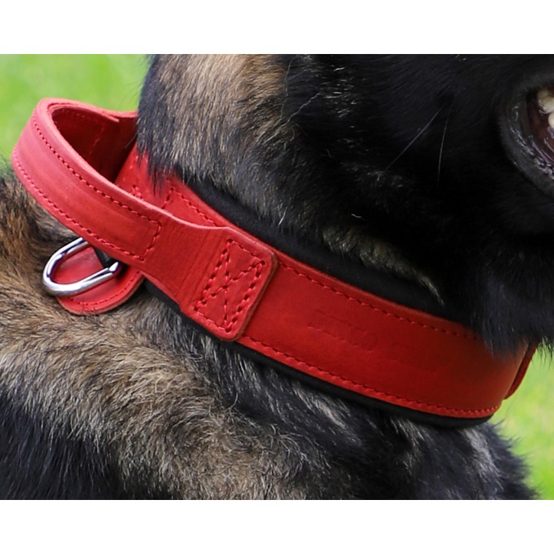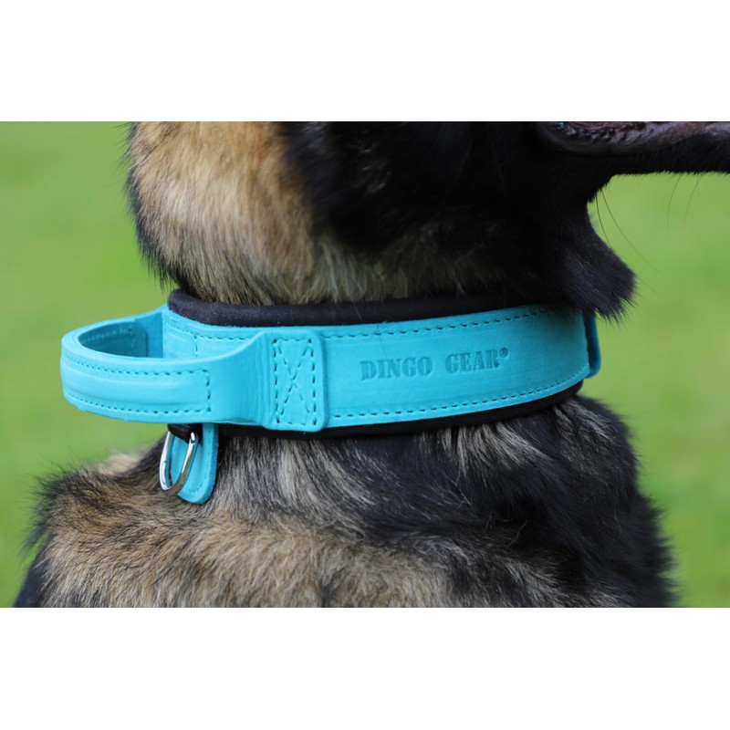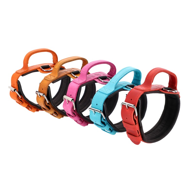 - The leather dog collar features a solid handle for holding, lifting, and stopping. The training collar is padded with soft material, making it comfortable for the dog to wear. The fittings are chromed