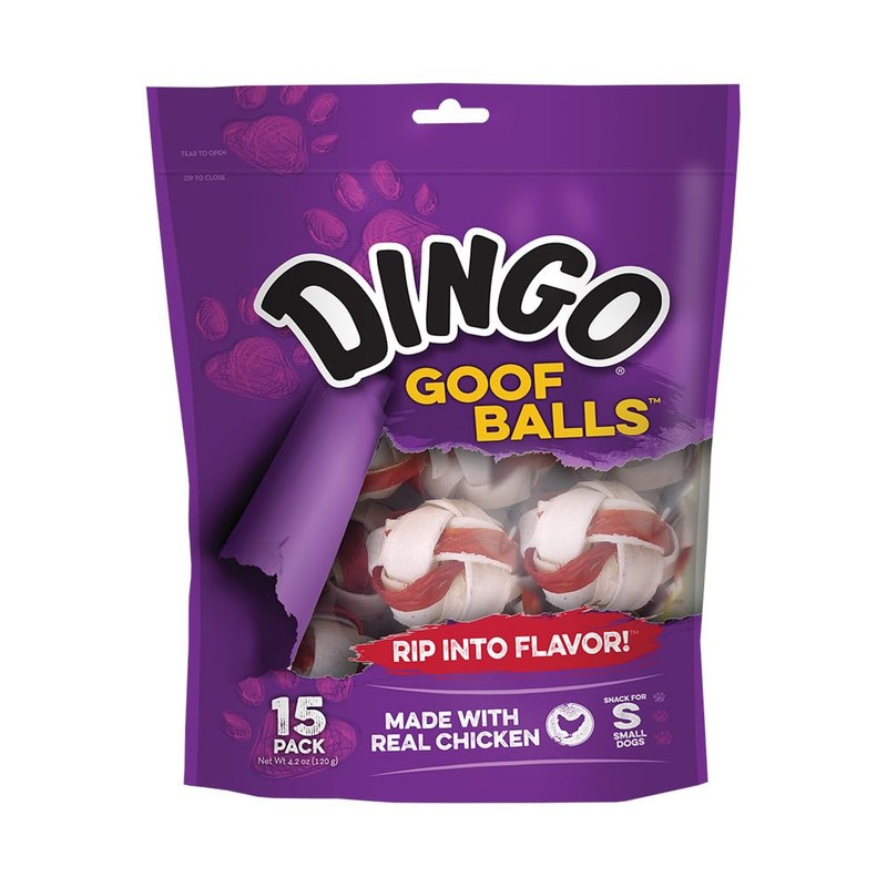Dingo brand’s real meat and rawhide combinations deliver healthy and delicious chews to promote clean teeth (due to the natural action of chewing). These premium rawhide chews are available in a range of irresistibly tasty treats that dogs love. Dogs go goofy for fun and tasty Dingo Goof Balls. Premium rawhide and real chicken are woven together into a ball shape to create a fun and flavorful chew for small dogs. These healthy, fun chews promote clean teeth through the natural action of chewing. Made without fillers or artificial binders, Dingo Goof Balls provide your dog with a fun, irresistible reward that's bursting with flavor. Resealable bag contains 15 chews. Look for other fun Dingo shapes and sizes too. Give your dog up to one Dingo Goof Ball per day as a treat or snack. For supervised consumption only. Select a chew slightly larger than your pet’s mouth. Discard chunks or fragments. Always provide plenty of fresh drinking water and visit your veterinarian regularly. Dingo brand combines powerful flavors and benefits to create bones, chews and treats that are sure to keep you and your dog wanting more. Shop our wide variety of shapes and flavors, with options for any size companion.