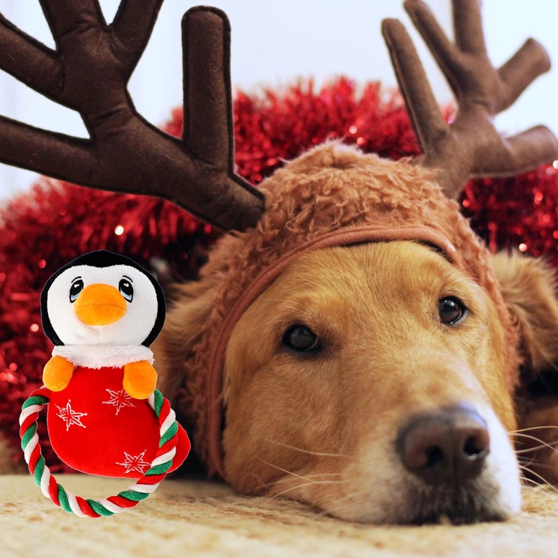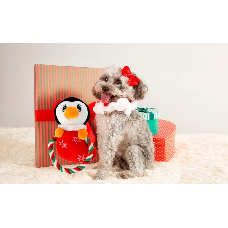 - The Christmas penguin with string is a dog toy made of braided cotton cord and a plush penguin with a safe filling inside