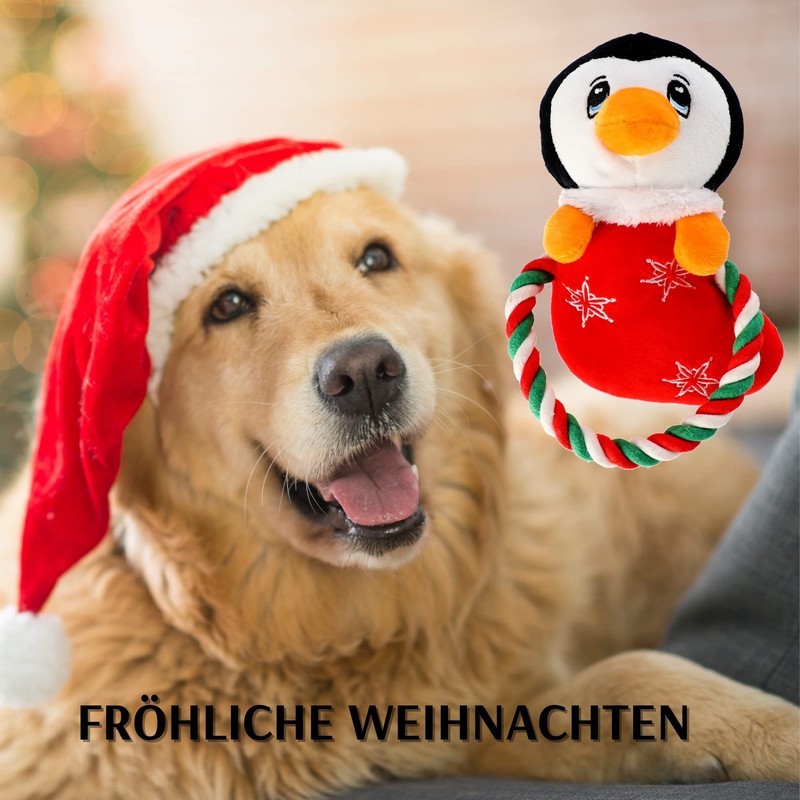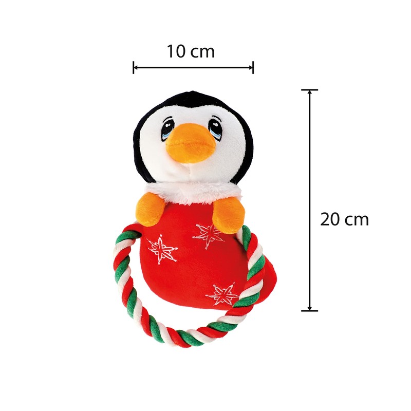 - In the middle of the filling there is a squeaker that stimulates playing. The Christmas penguin dog toy with string: total length of the toy including string: approx. 20 cm