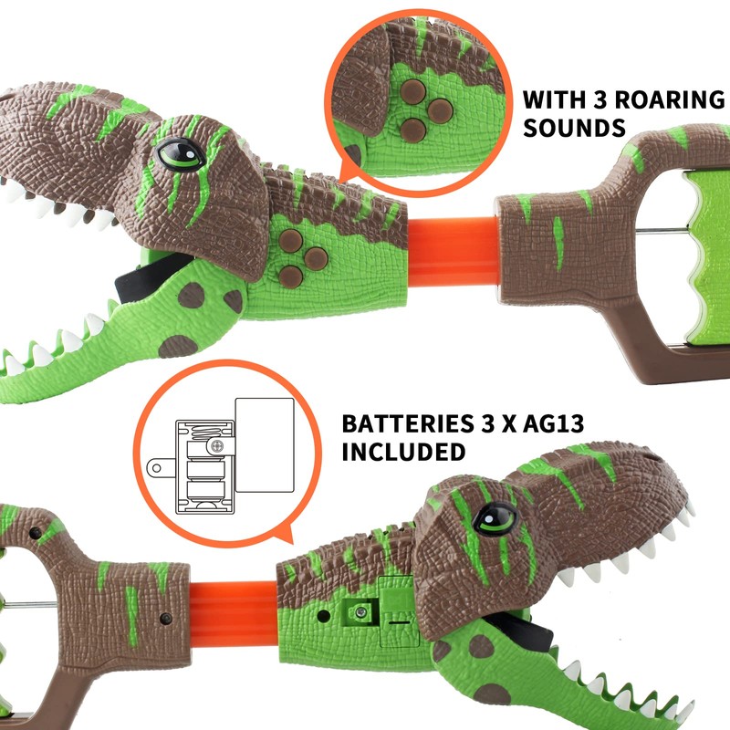 - LIGHT AND SOUND EFFECTS: A 13.6 Inches dinosaur reacher grabber with light and sounds. Pull the handle on this T-Rex toy and the mouth snap, press the 3 sound button on the dino body to make 3 kind of prehistoric roaring sounds and light up.