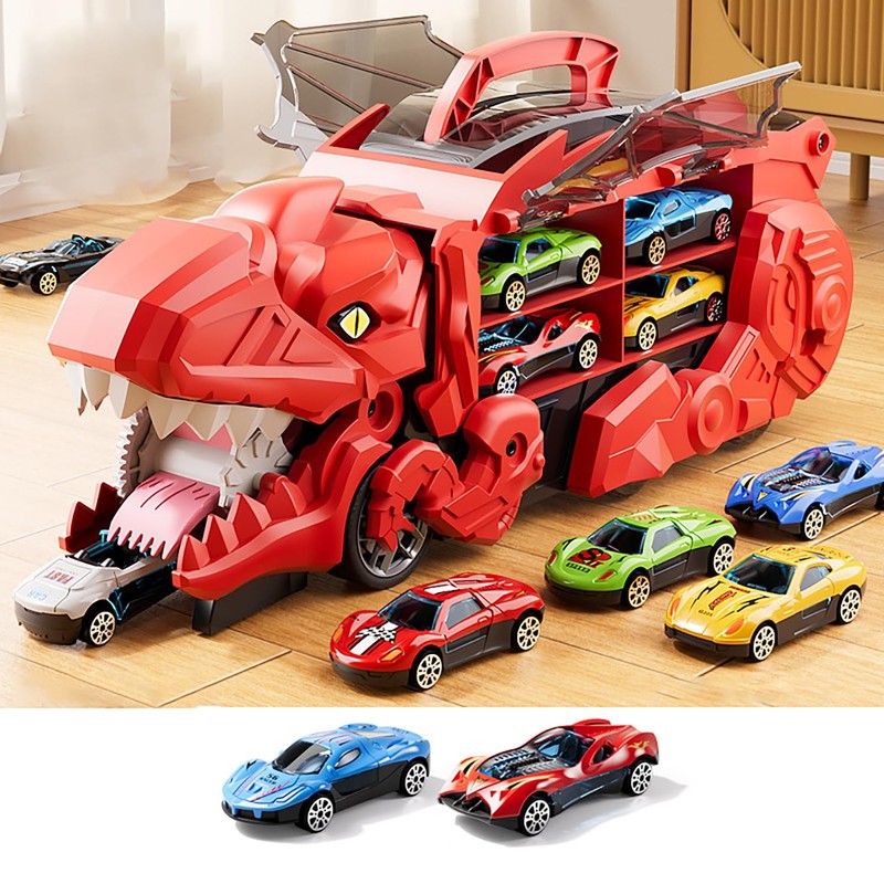 - 【4 in 1 Dinosaur Toy Trucks Set】This large dinosaur truck toy swallows cars and transforms into a cool standing Dinosaur with 2 tracks for sliding races, and the t rex dinosaur toy can store over 16 metal cars, inspire creative storytelling adventures, will be a hit with the younger kids in your family on holiday day. Non toxic, BPA Free and washable.