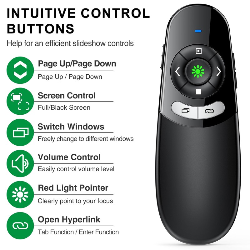 - 【Brigher Green Light & Long Control Distance】The brighter green light is easier to see than red light, even on LCD displays and in brightly lit rooms. Wireless remote control distance range of up to 164ft, so you can free to move around the room, and bright light highlight key areas of your slides to your audience’s attention