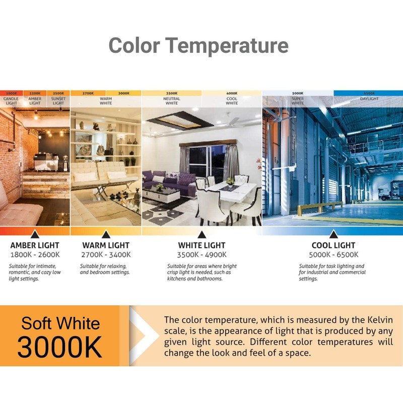 - Crisp 3000K Soft White Color Temperature - The bulb emits a balanced 3000K soft white light that closely mimics natural daylight. This color temperature is ideal for task lighting, as it reduces eye strain and enhances visibility without the harshness of cool white or the yellow tint of warm white lights. It creates a clean and professional ambiance suitable for a wide range of settings, from workshops and classrooms to retail stores and homes.