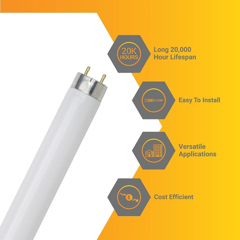 - Standard 24-Inch Length with G13 Bi-Pin Base Compatibility - Designed to fit standard T8 fixtures, the 24-inch length and Medium Bi-Pin (G13) base make installation simple and versatile. Whether upgrading an existing fixture or replacing an old tube, this bulb is compatible with most 2-foot linear lighting setups, allowing for hassle-free replacement in a variety of applications. Its universal fit ensures it can seamlessly integrate into your existing lighting system.