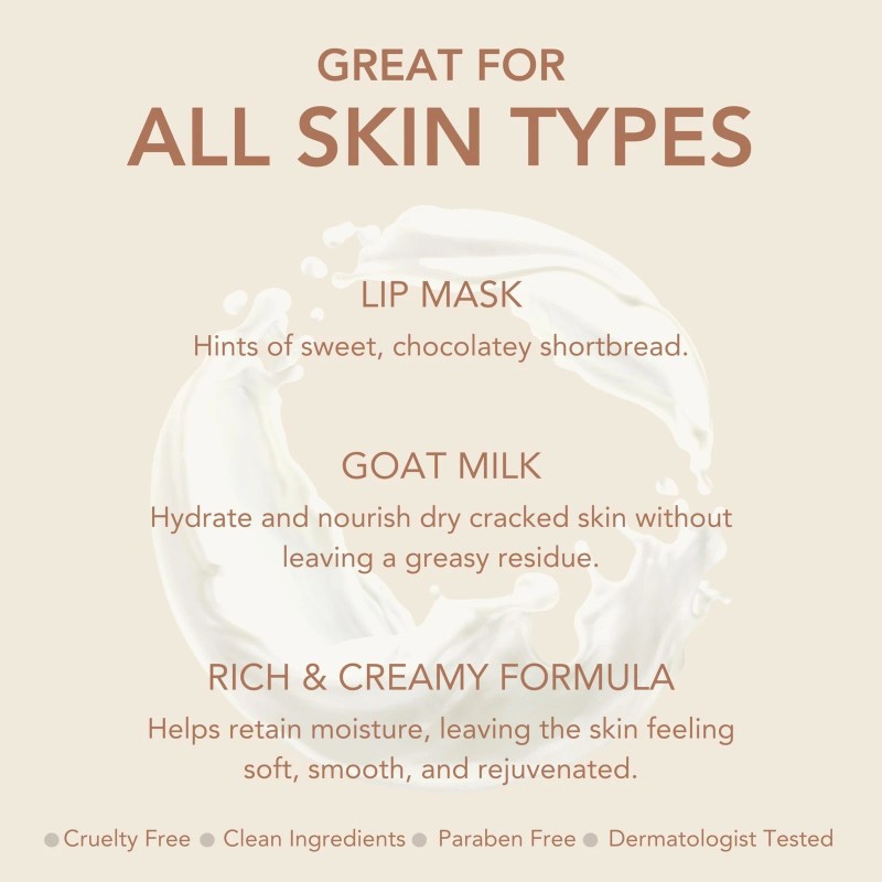 • Lip Repair - Wake up to soft and supple lips with our intensely moisturizing goat butter overnight leave-on lip mask. Made with goat milk + jojoba, raspberry, and moringa oils, this gentle formula will add moisture to cracked, chapped, and dry lips while you sleep.
