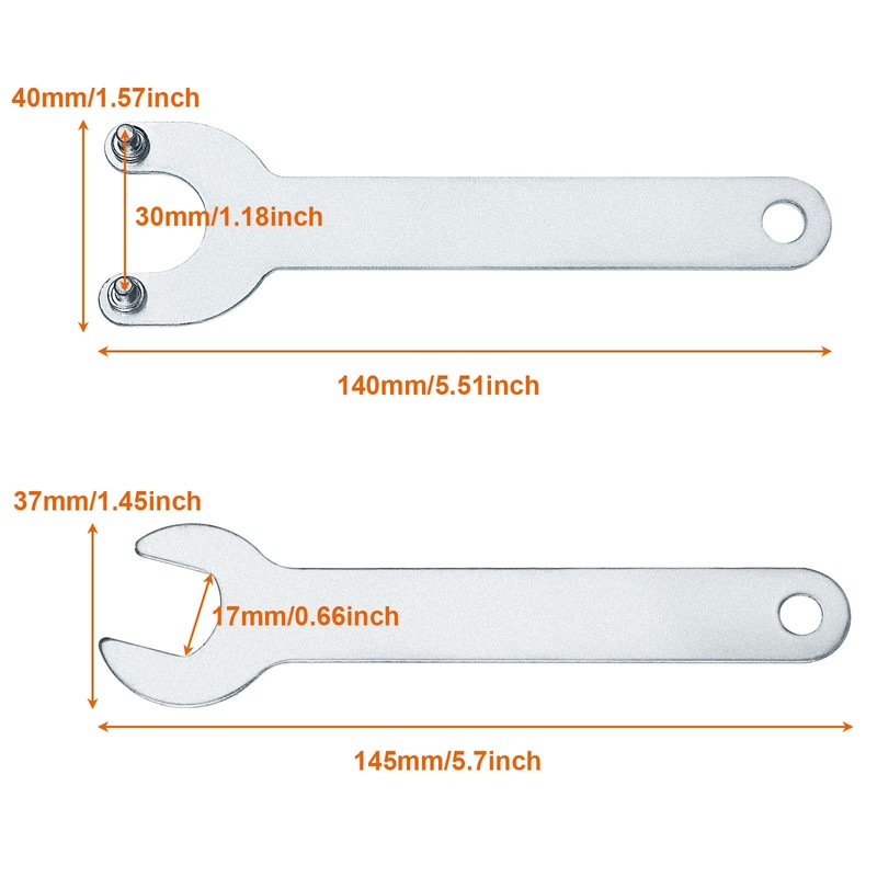 - ★The Angle Grinder Spanner wrench is approx. 5.5”/ 140mm length, and for the flange nut, the outer diameter is 0.55”/14mm, the inner diameter is 0.61”/15.5mm