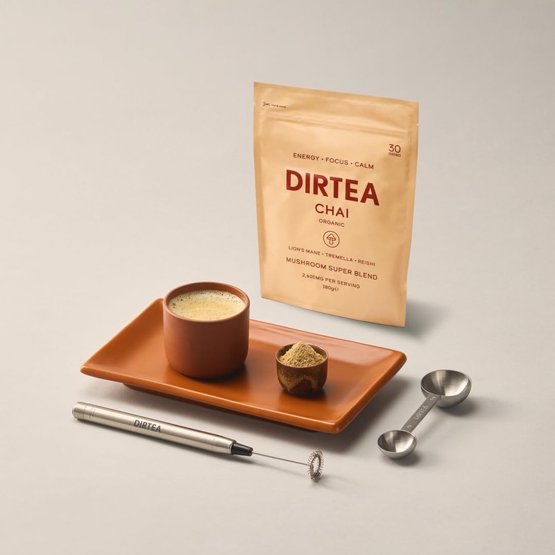 - NOURISHING CHAI: DIRTEA Chai combines aromatic spices with Lion's Mane, Tremella, and Reishi, creating a powerful adaptogenic blend that supports focus, immunity, and skin hydration.