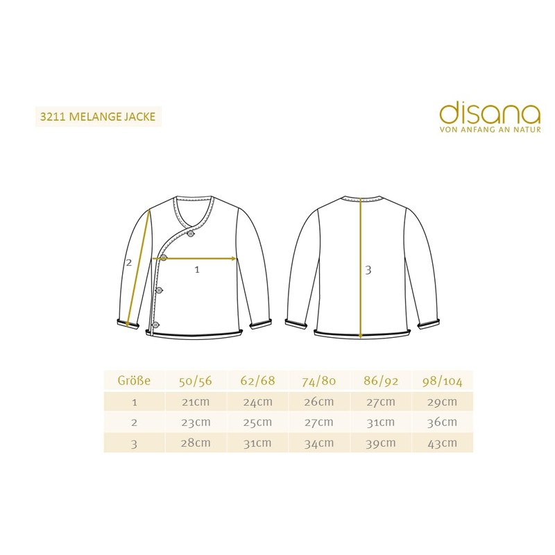 - Features: with its front wrap closure, the Disana jacket made of organic merino wool is easy to put on even on the lying child. No button presses when prone position. Our melange jacket is wonderfully soft and elastic and especially suitable for newborns.