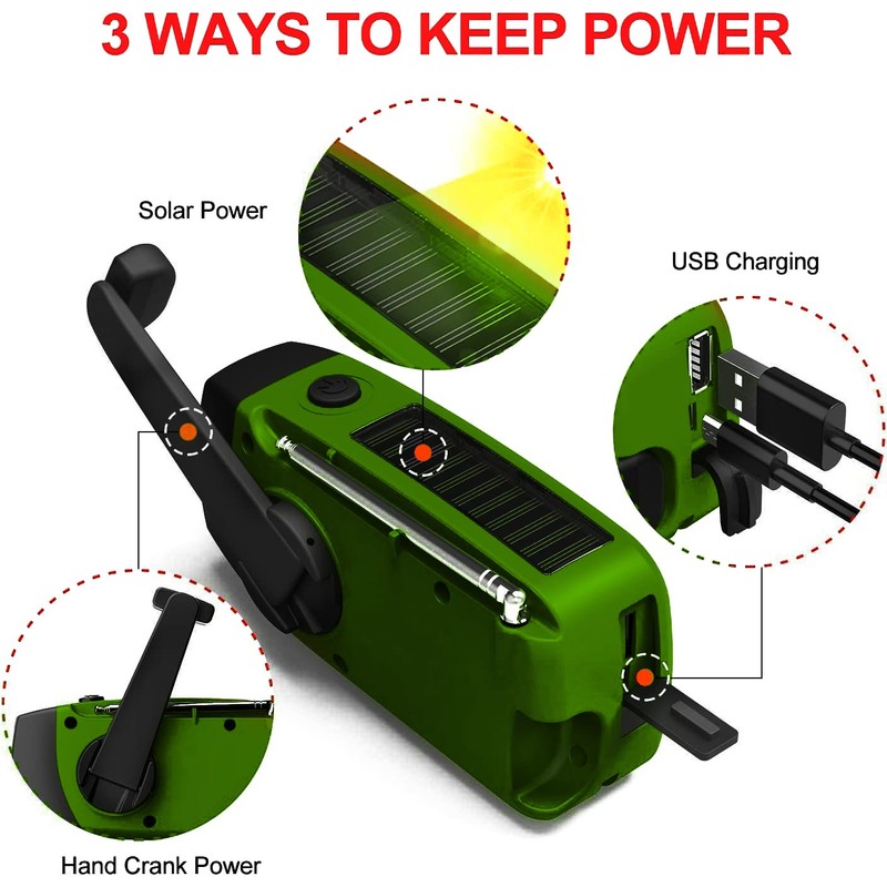 - 3 charging methods: Hand crank charging hand crank radio: You can charge it by turning the handle on the back of the product. Solar charging radio light: When the solar panel is turned towards the direction of sunlight, it can be charged automatically.