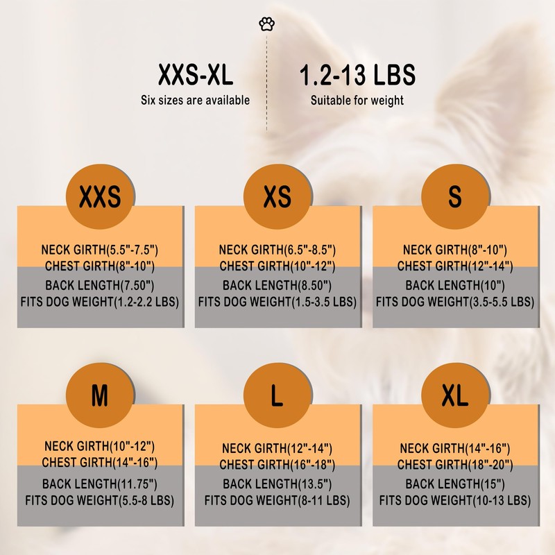 - Sizes: The shirt is available in different sizes to fit small to medium-sized dogs. Be sure to measure your dog's chest and neck girth before purchasing to ensure the best fit. The size chart can help guide you in choosing the right size for your pup.