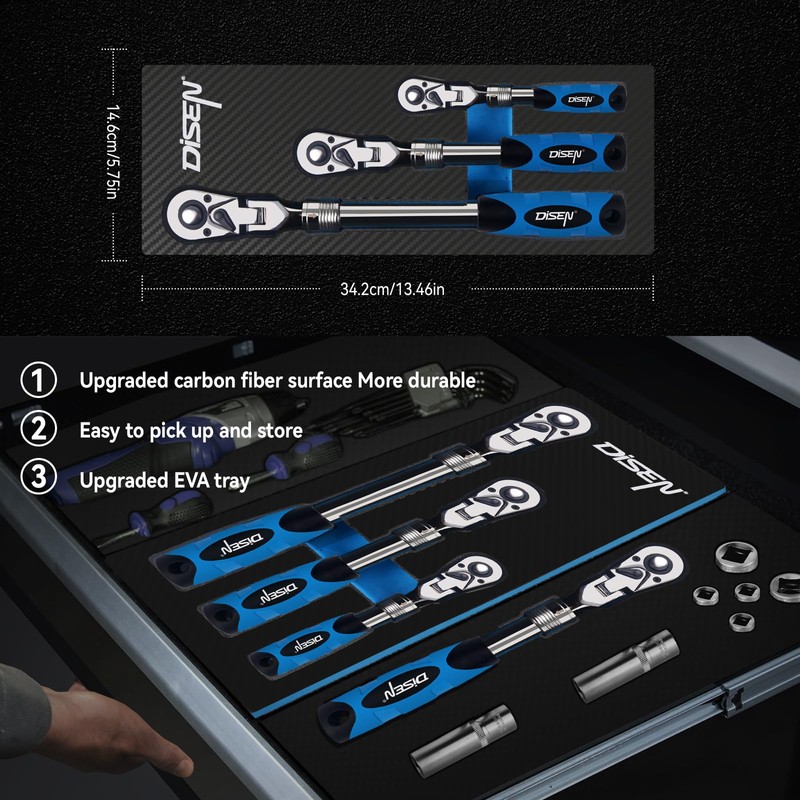 DISEN DISEN 3-Piece Extendable Flex-Head Ratchet Wrench Set with EVA Storage Case - 1/4", 3/8", 1/2" Drive, 72-Tooth, Rubber Grip, Adjustable Length - Professional Automotive and DIY Tools
