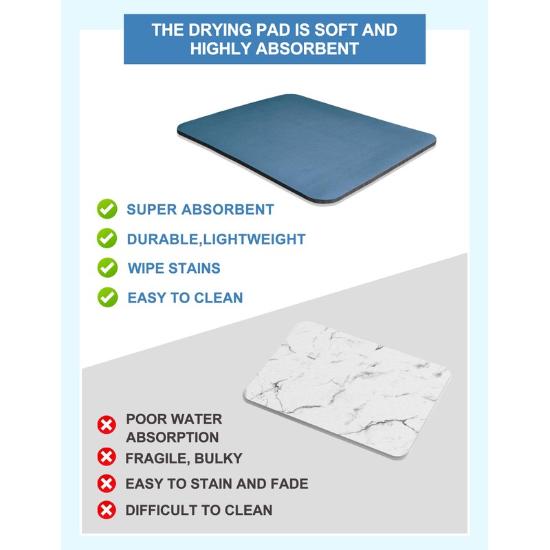Microfiber dish drying mat is made of super absorbent nano, the drying pad is soft and highly absorbent, which can dry quickly. In addition, the drying mat is thick enough to better protect countertops, tableware, and glassware from damage and contamination.