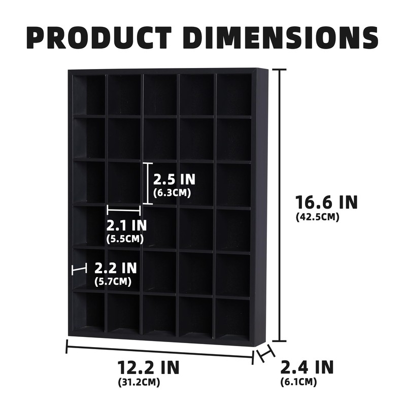 Wall Curio Rack Shelving for 49 Regular size shot glasses, small rock/gemstones, small crystals, or block toy minifigure men. Black finish. Wall mountable with brackets on the back. A simply and easy way to order and display small collectible items.Total Dimensions: 18-1/4" x 14-1/4" x 2-1/2". There are total of 49 slots With 42 small slots at 2.5"H X 2.25"W X 2.35"D each, and 7 Tall Slots at 4"H X 2.25"W X 2.35"D.