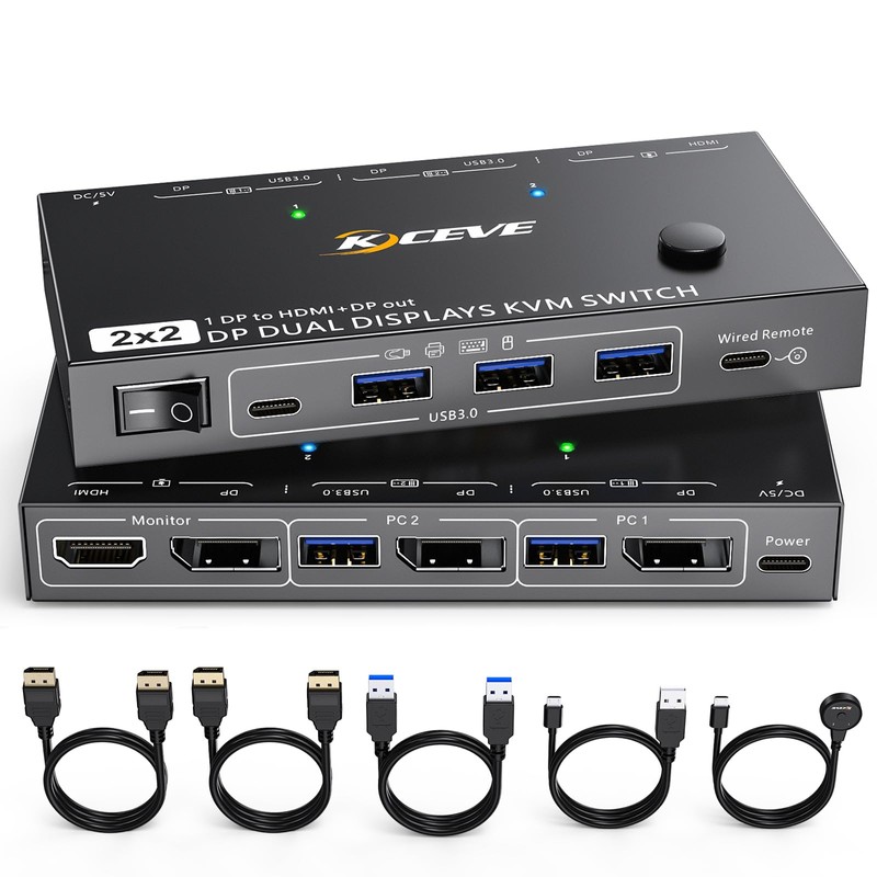 - 【2 in 2 out DP KVM Switch MST function & HDMI and DP out】DP KVM dual monitor switch allows you to connect 2 DP port computers to share 2 monitors (DP +HDMI). support ‘duplicate/mirror’ . In ‘duplicate’ mode the main screen can be copied to the secondary screen. In ‘mirror’ mode, the window from main screen can be dragged to second screen.