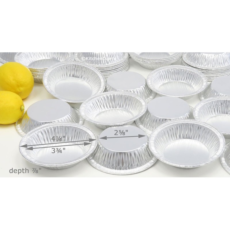 Disposable aluminum foil tart pan that's fairly deep for its small size. Use this pan for small cream pies (individual size), fruit tarts, dipping sauces, sample pan, etc. Quality is good, made in USA. Top outside diameter (rim to rim): 4-1/4” Top inside diameter: 3-3/4” Bottom diameter: 2-5/8” Depth: 7/8” 25 gauge aluminum foil Capacity: 4 fluid oz