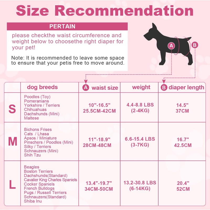 - 90 COUNTS SMALL FEMALE DOGS :Designed for small/medium female dogs, with a waist of 11-18.9 inches and a weight of 6.6-15.4 pounds. Please choose the right size for your dog.90 pieces, sufficient for daily use of puppies, no need to purchase multiple times