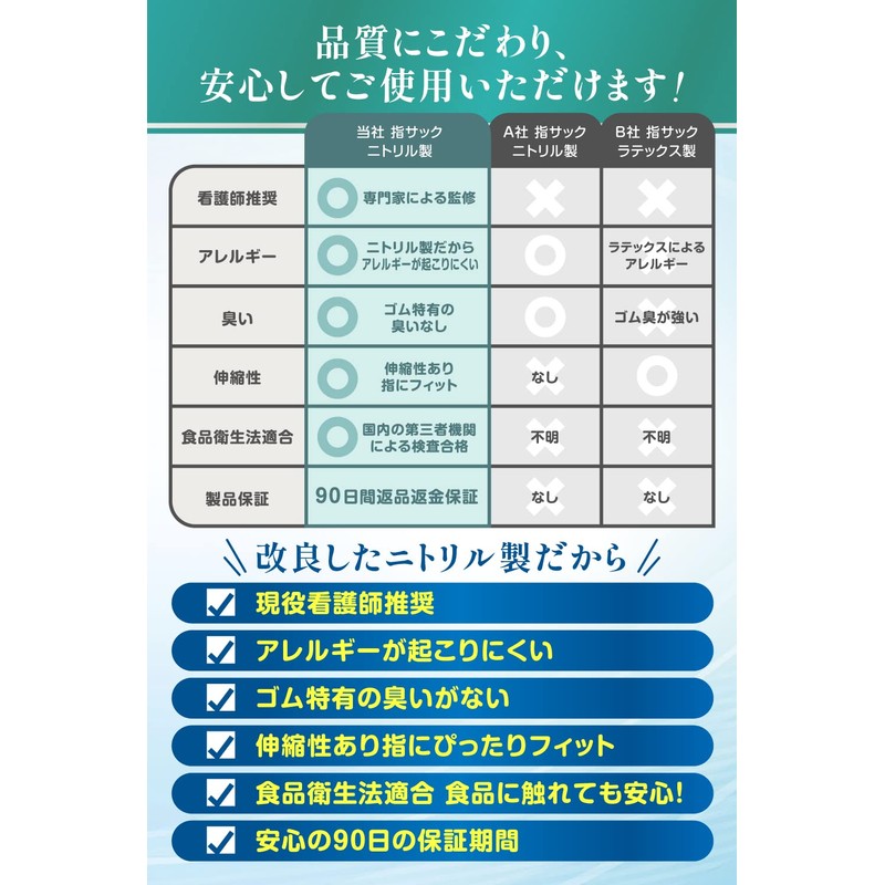 (Recommended for Active Nurses) Made of latex-free nitrile (synthetic rubber), so it does not have a unique smell of natural rubber, and is resistant to allergies, so you can use it with confidence. (Secure Fingertip Protection) The nitrile material has excellent pulling, puncture, abrasion resistance, oil and chemical resistance, so you can secure your fingertips with pinpoints. It can also be used to cover the pills and cream that have troubled fingertips to maintain the effect. Snug Fit on Fingertips: Improved elasticity of the existing nitrile finger sacks for a more snug fit. There are also 3 sizes for you to choose which one fits your finger perfectly. It fits your fingers so it is suitable for a variety of tasks without losing the feel of your fingertips. Passed by the Japanese Inspection Organization: With a wide range of uses and usability of our finger sacks, we will deliver a finger sack that is "Compliant with Food Sanitation Law" by a domestic inspection institute. (Can be used for a variety of uses) Can be used in a variety of situations in your life, such as working on your computer, working at the office or studying, operating your smartphone, cooking, etc.