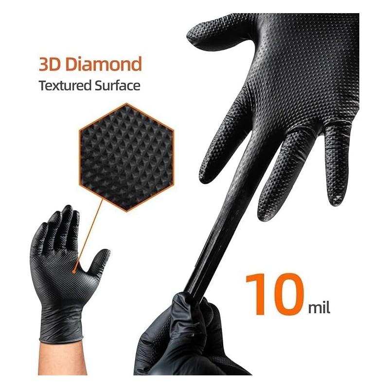 Disposable Nitrile Rubber Repair Gloves, 50 pcs, Heavy Duty 10 Mil Mechanic Gloves, non-slip diamond texture, Tough and Strong, for Oil Work, Painting, Auto Repair, Industrial (Black, M)