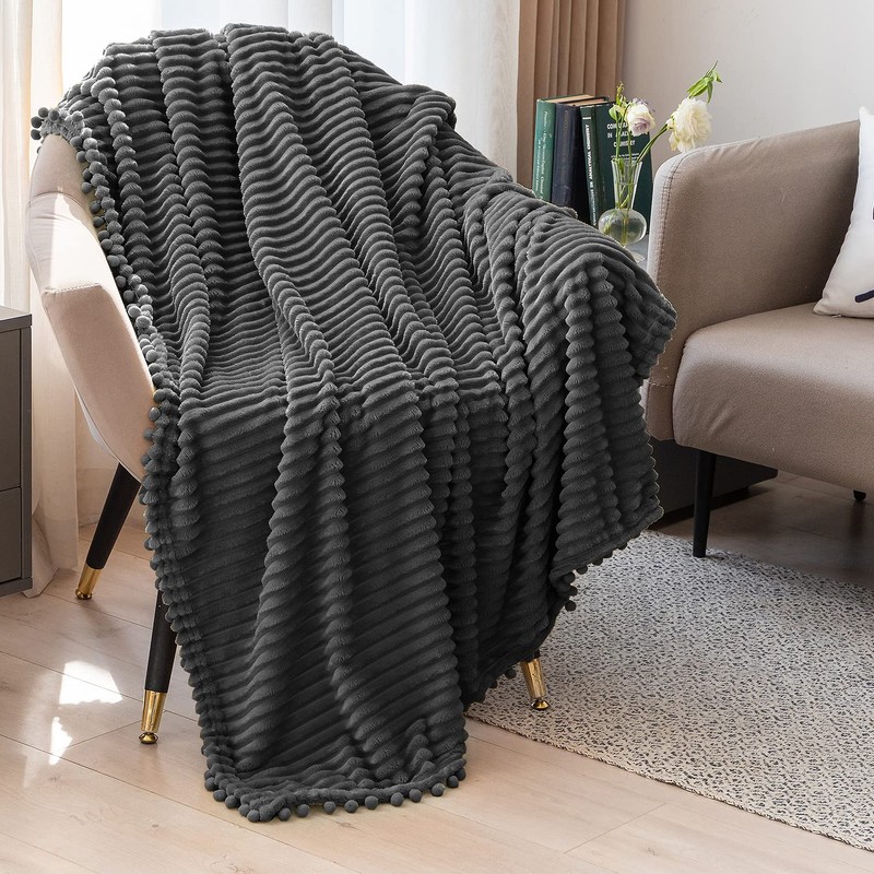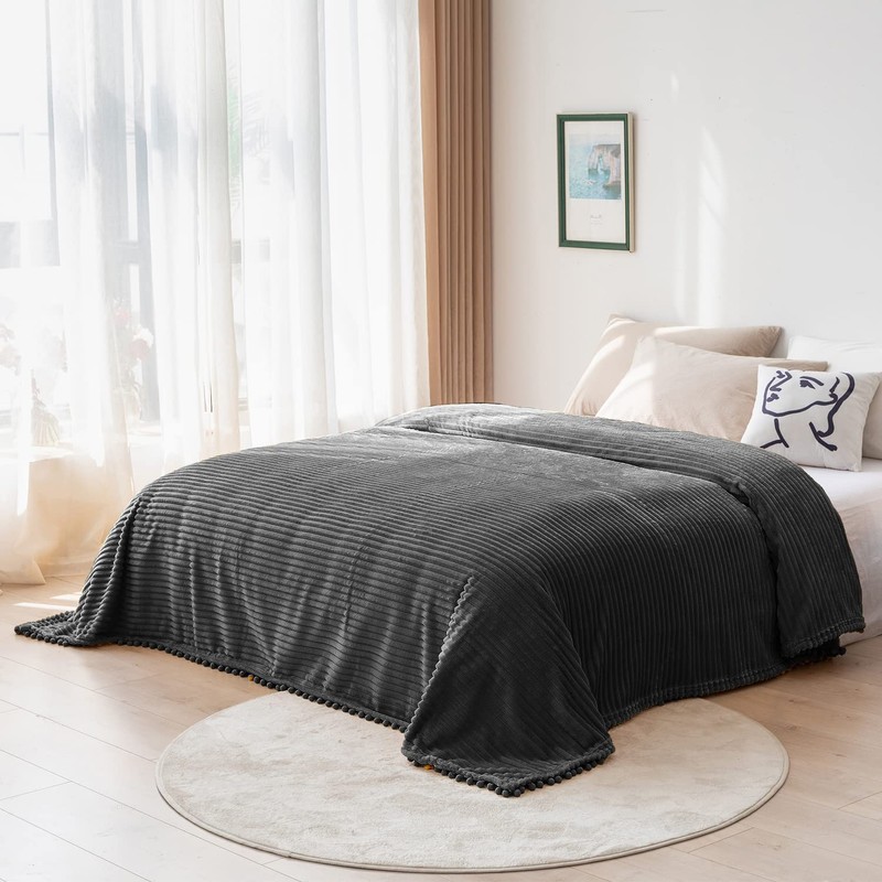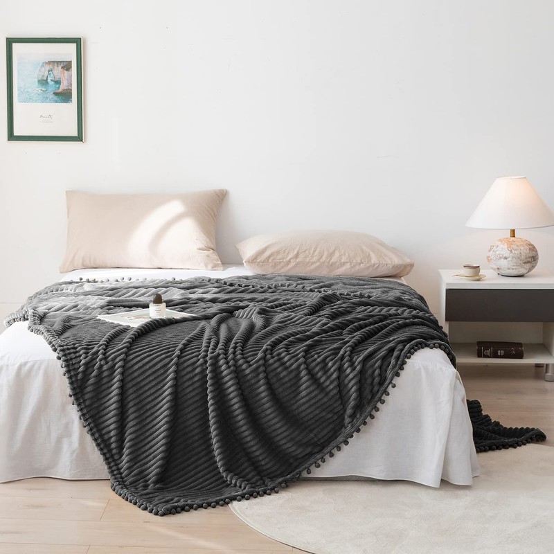 DISSA Fleece Blanket Twin Size – 60x80, Dark Grey – Soft, Plush, Fluffy, Fuzzy, Warm, Cozy – Perfect Throw for Couch, Bed, Sofa - with Pompom Fringe - Flannel Blanket Throw Blanket