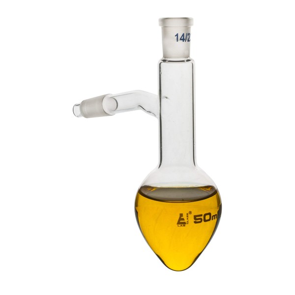Distilling Flask, 50ml - 14/23 Joint & Side Socket - Borosilicate Glass, Pear Shape - Short Neck - Eisco Labs