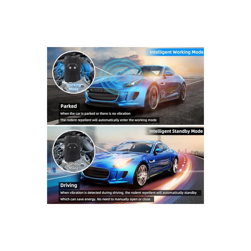 - Características de detección inteligente: El repelente de ratas para automóvil incluye una autoprueba de encendido y detección de vibraciones, cambiando automáticamente al modo de espera mientras se conduce y se activa 5 minutos después del estacionamiento para proteger su vehículo de roedores