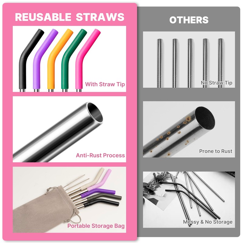 - Silicone Tips: Equipped with food-grade silicone straw tip, it is soft and lightweight and fits your lips, avoiding direct contact with hard metals and effectively protecting your teeth.
