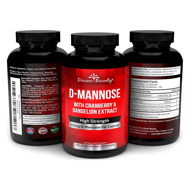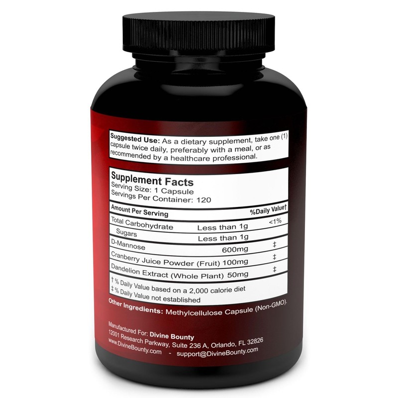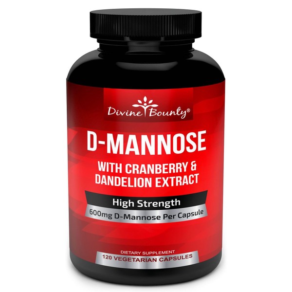• More Potent Source Of D Mannose - If you are looking for superior D Mannose Capsules, look no further! Divine Bounty offers one of the most potent D Mannose formulas available. Our extra strength formula contains an incredible 600mg D-Mannose in just one capsule, plus includes cranberry juice powder and dandelion extract for additional support.