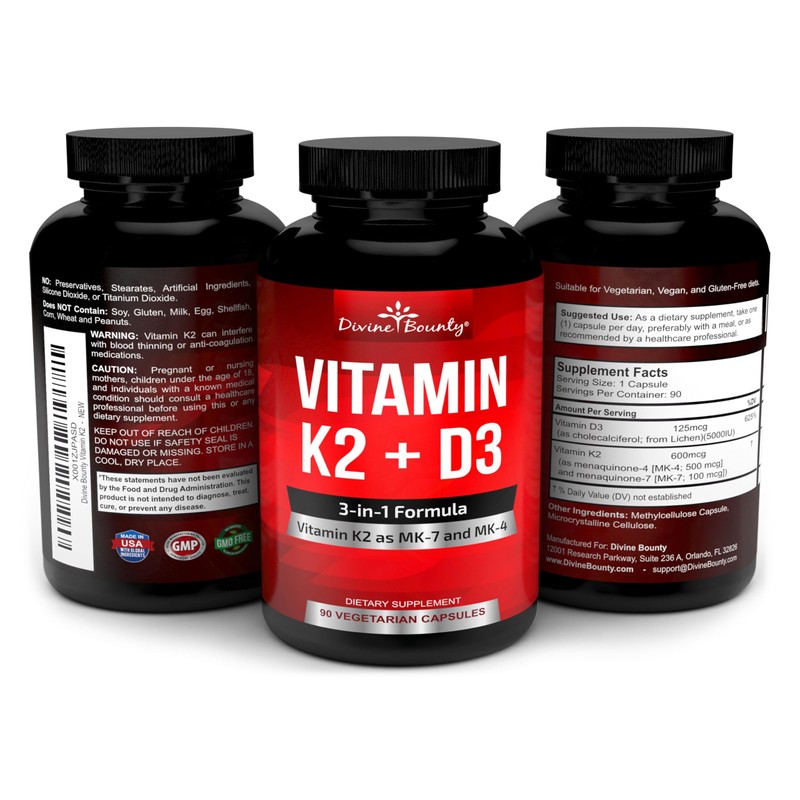 - More Potent Source - If you are looking for a superior Vitamin K2 with D3 supplement, look no further! Divine Bounty's 3-in-1 supplement offers one of the most potent formulas available. Unlike competitors who only include one type of K2, Divine Bounty has both forms of Vitamin K2 MK7 and MK4 as they compliment each other. To top it off, adding in Vitamin D3 5000 IU really makes this a unique, winning formula.