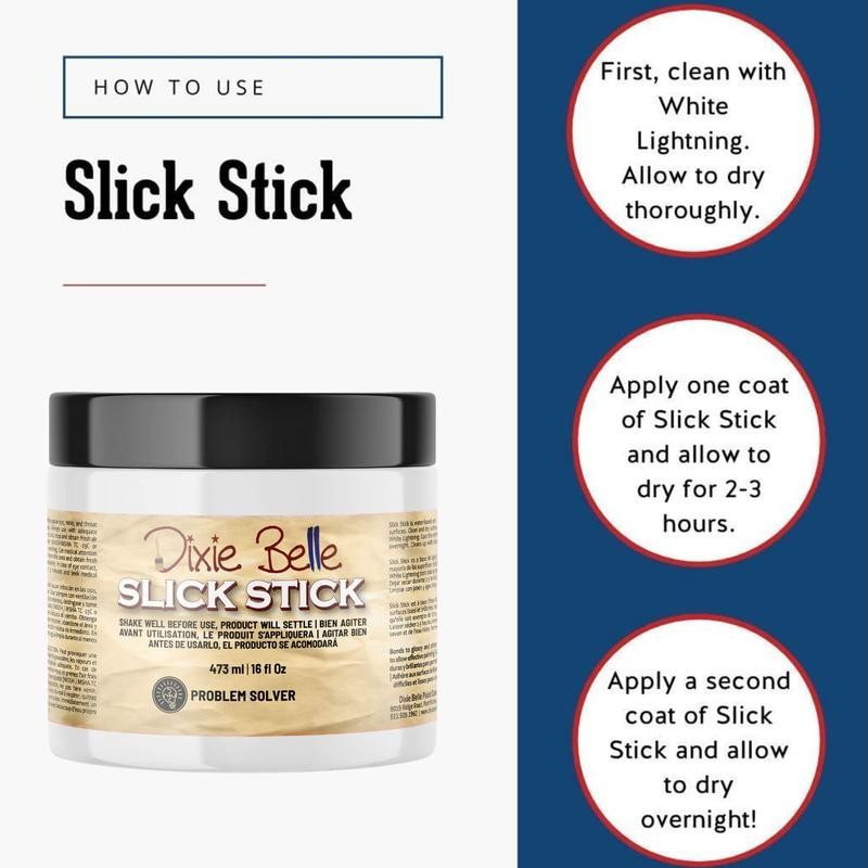- HOW TO USE – Clean your piece with our White Lightning Cleaner (sold separately but recommended). Paint one coat of Slick Stick and let dry for 2-3 hours. Apply a second coat of Slick Stick and let dry overnight. One cured and fully dry, paint over your surface with increased ease without worrying about the paint chipping or slipping. Problem solved!