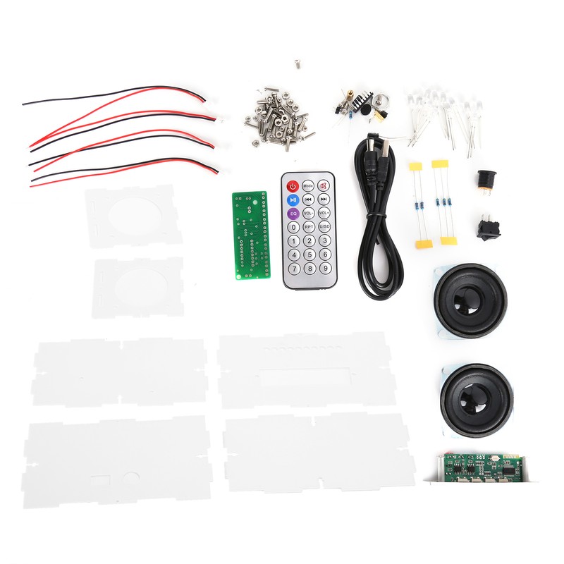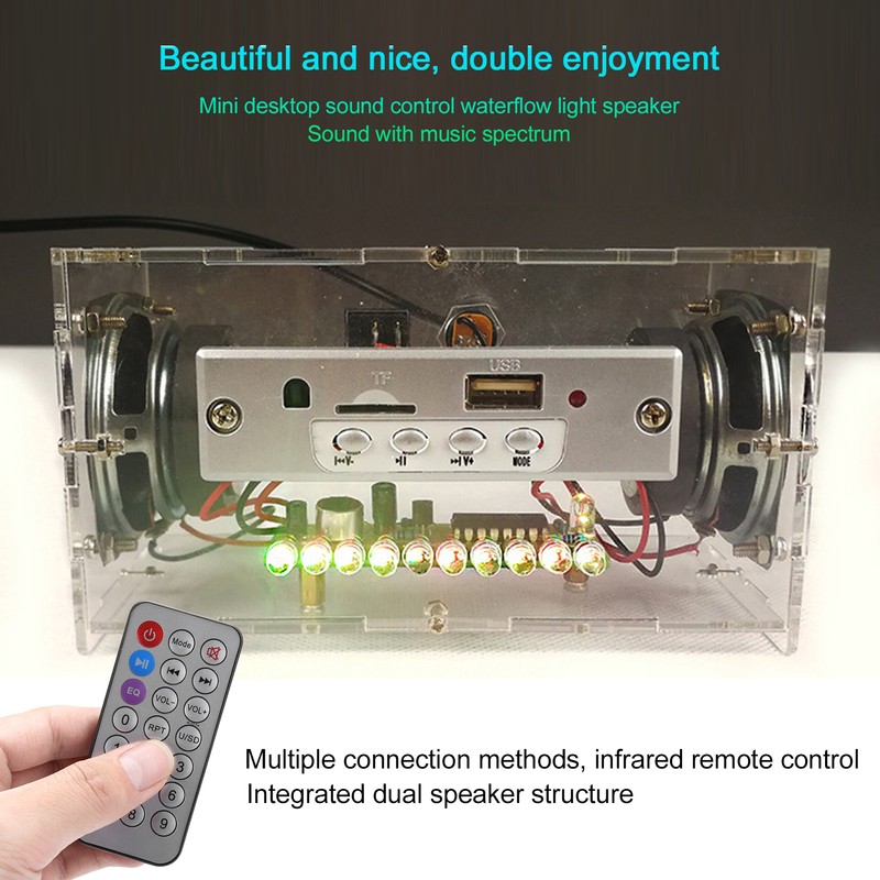 1、Bluetooth 5.0 music player, support auto play, pause, up and down music, memory card playback (not include). 2、USB input interface(not include), remote control, support power‑off memory, all‑in‑one speaker is easy to install, powerful with remote control. 3、Full frequency response, high‑fidelity speakers, high, middle and low three‑band in one, pure pleasing sound, large volume, 3W power speakers, total 6W left and right. 4、The shell is made of imported transparent acrylic, which is 1.8mm/0.07in thick, with voice control light. 5、With the mobile phone bluetooth connection function, the infrared remote control function does not need to connect the audio cable.