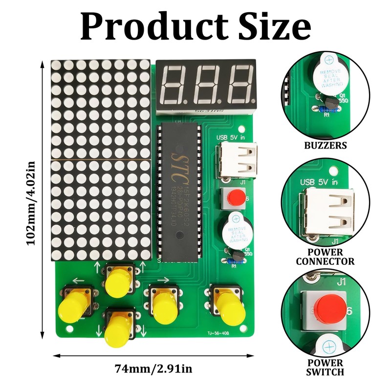 - Functions and features: This soldering kit supports pausing games, turning on and off game sound effects and adjusting the screen brightness.