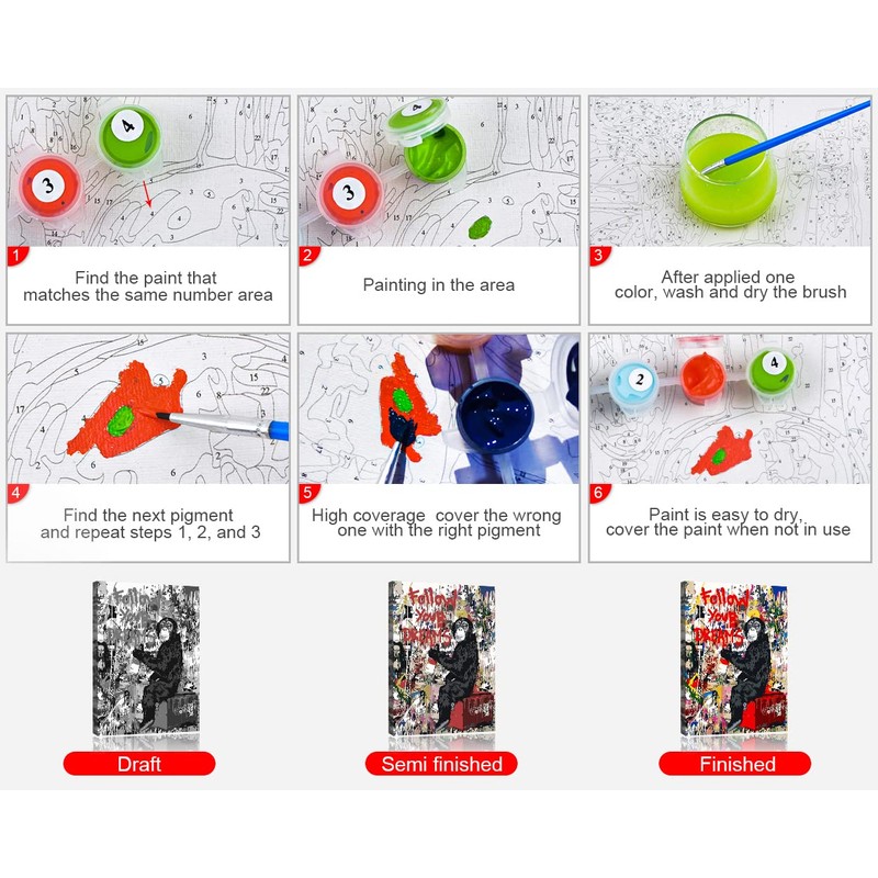 - How to DIY: Paint number are suitable for adults, children and beginners of all ages. Look for the number on the canvas is same the acrylic paint set' number. Then painting in Corresponding area by brushes. No color blending need.