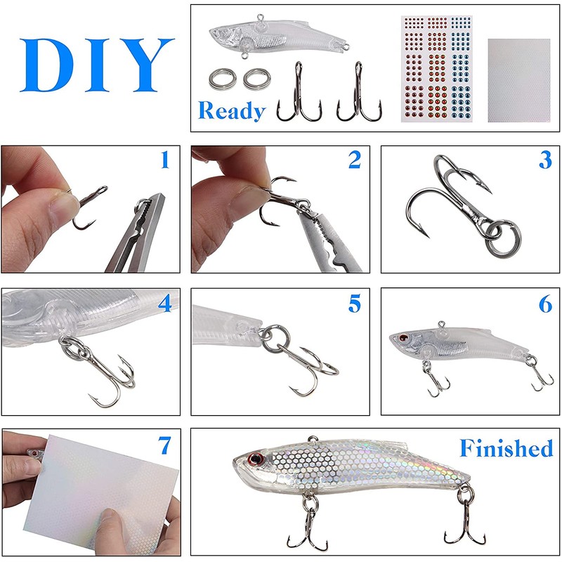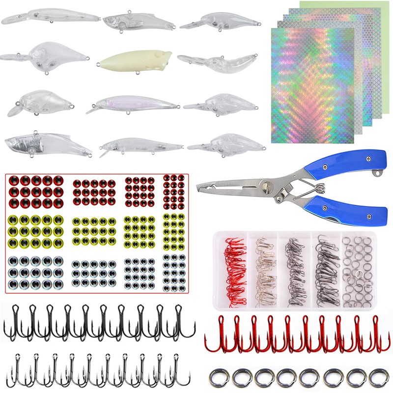 - 【Various Fishing Accessories】321pcs unpainted blank lures kits with 12pcs clear lures, 85pcs fishing treble hooks, 35pcs split rings, 5pcs Sticeker,183pcs 3D fishing eyes, 1pc blue fishing plier.