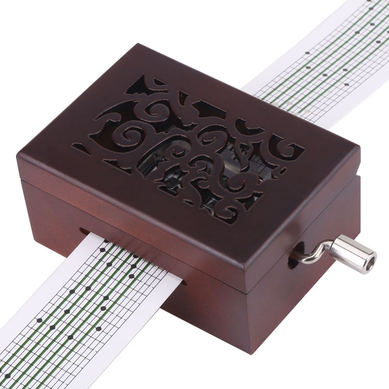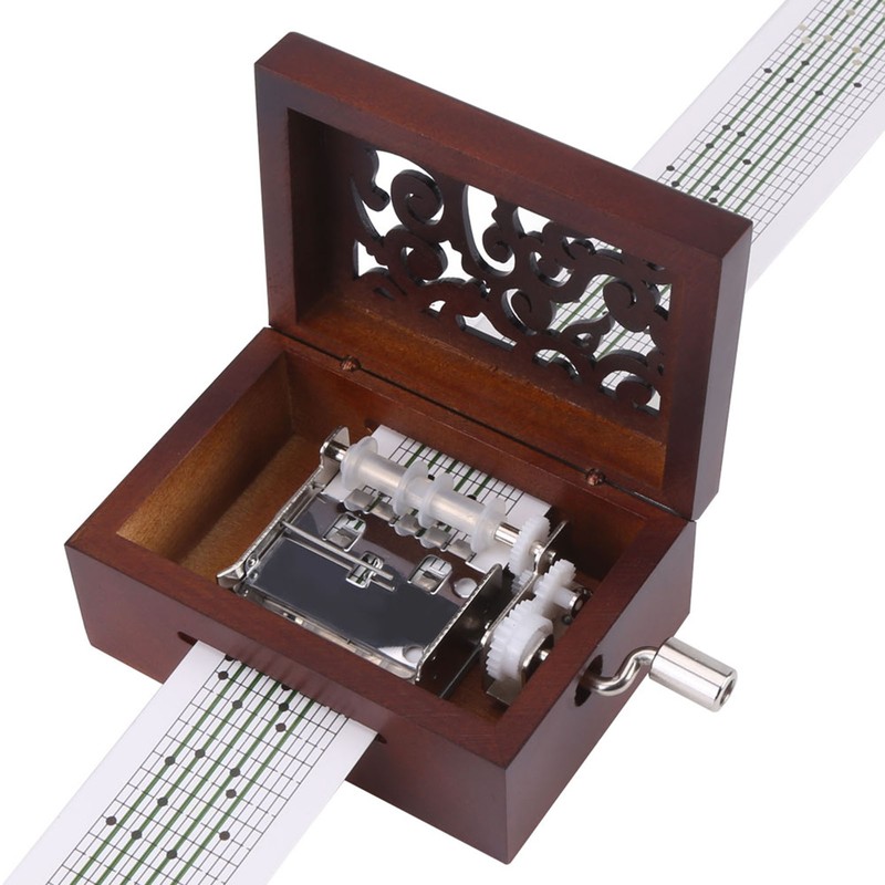 Love music boxes but never seem to be able to find the music you really want on a music box? Look no further, the music box is operated by turning the hand crank as the music tape is feed through the music box. With proper tools (tapes and hole puncher, not included), you can write your own music and play it on this music box.