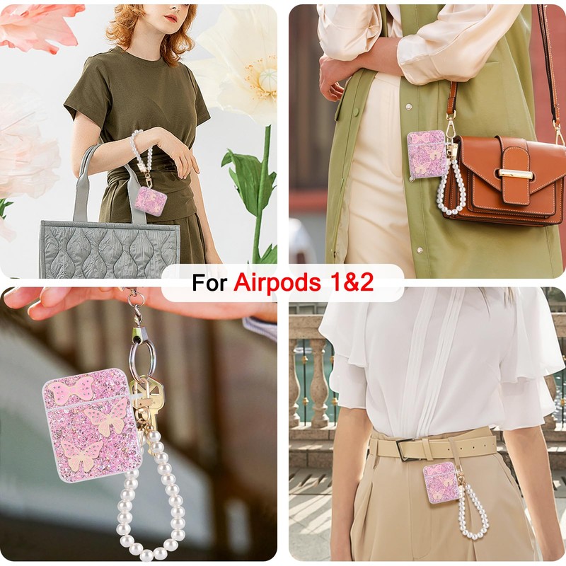 DiyGody for AirPods 1/2 Case Cover Glitter Butterfly with Pearl Bracelet Keyc...