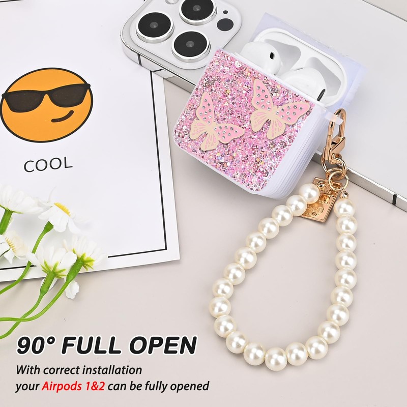 DiyGody for AirPods 1/2 Case Cover Glitter Butterfly with Pearl Bracelet Keychain, Sparkle Bling Shockproof Full Protective Cover Case for AirPods 2nd Generation (Pink)