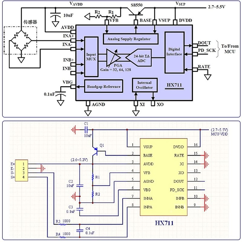 The weight module uses 24 high-precision A/D converter chips hx711, specially designed for high-precision electronic scales with two analogue input channels, the internal integration of the 128x amplifier with programmable gain. The input circuit can be configured to create a bridge type pressure bridge (e.g. pressure load sensor mode). It is highly accurate and cost-effective and an ideal sampling front-end module.