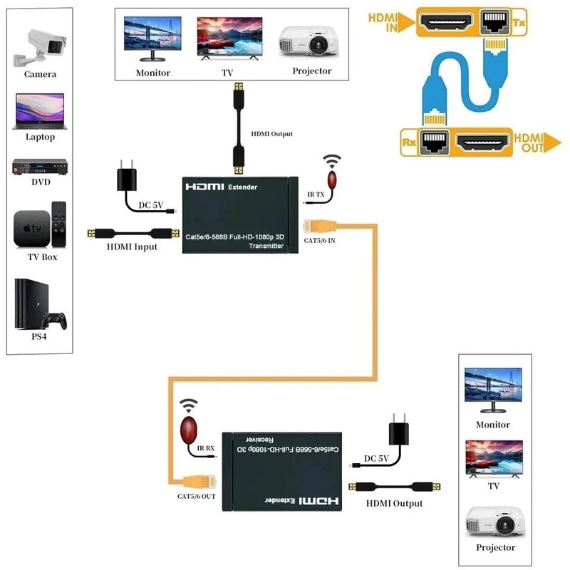 - Installation Requirements】-- Requires one single cat6/6A/7 cable to connect TX and RX side. Suitable for HDMI source device(computer graphics card, DVD,PS3, HD monitoring equipment etc); HDMI display device like SDTV, HDTV, sony/Epson/samsung projector with HDMI port; DON'T work for cable box