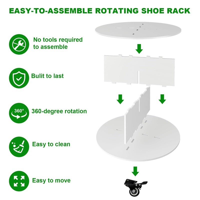 360° Space-Saving Design: Efficiently store and access your shoes with this rotating shoe rack. Its 360° design maximizes space, making shoe retrieval effortless and eliminating clutter