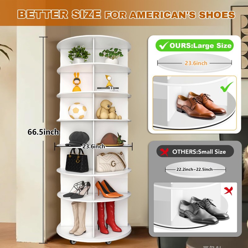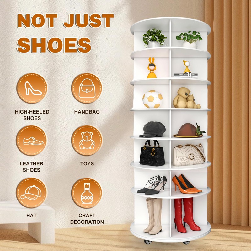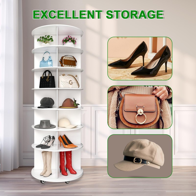 • Quick Assembly & Customizable Storage – No tools needed! Assemble this ​rotating shoe rack tower 360 in minutes. Its space-saving 24”x24” footprint holds 7 tiers of shoes, bags, or accessories. ​Upgraded bottom tier is raised to fit boots, while lockable wheels let you glide and secure it anywhere—no more heavy lifting!