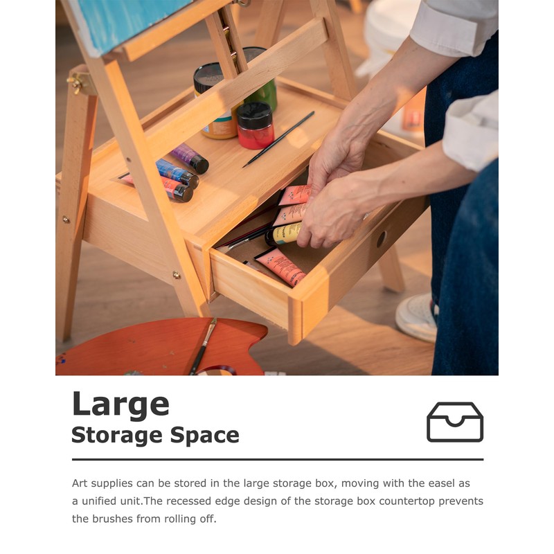 • Ample Storage Space: Features a spacious drawer to store paints, brushes, markers, pencils, paper, sketchpads, and other essential art supplies. The top of the drawer also serves as an additional storage area for frequently used tools