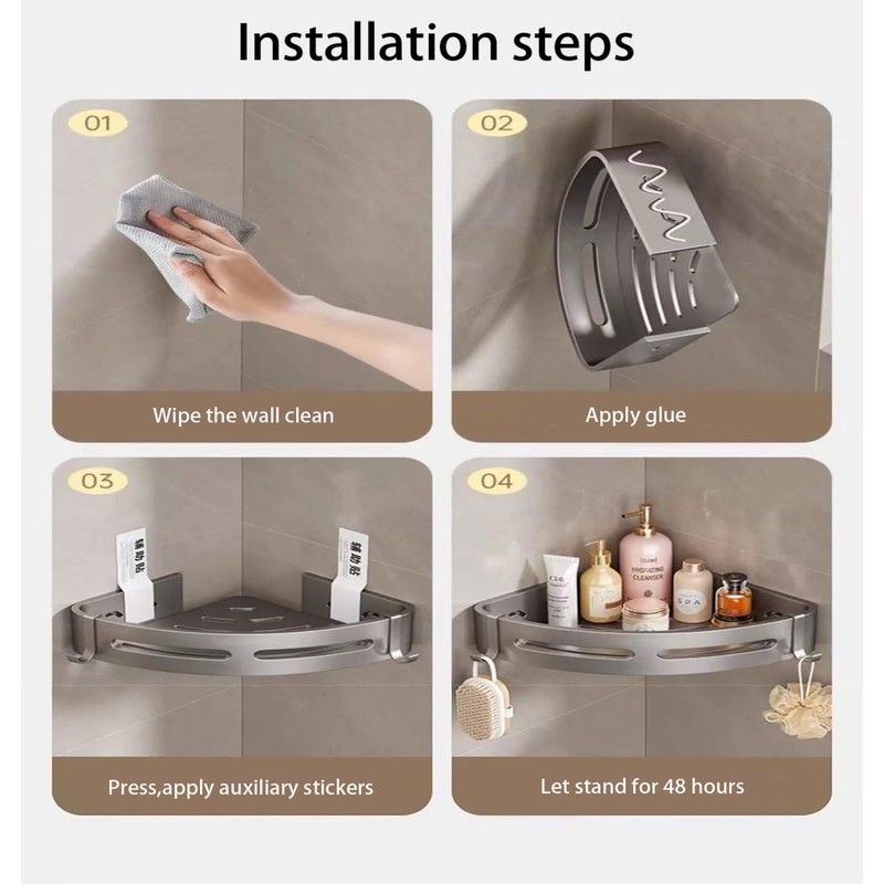 - đăDurable ConstructionăOur corner shower shelf made of high-quality material, waterproof, rust-proof, scratch-resistant. No more worrying about corrosion or damage due to water exposure.The shelves can be installed on smooth surfaces using the included strong adhesive or by drilling into the wall, offering versatile mounting options.