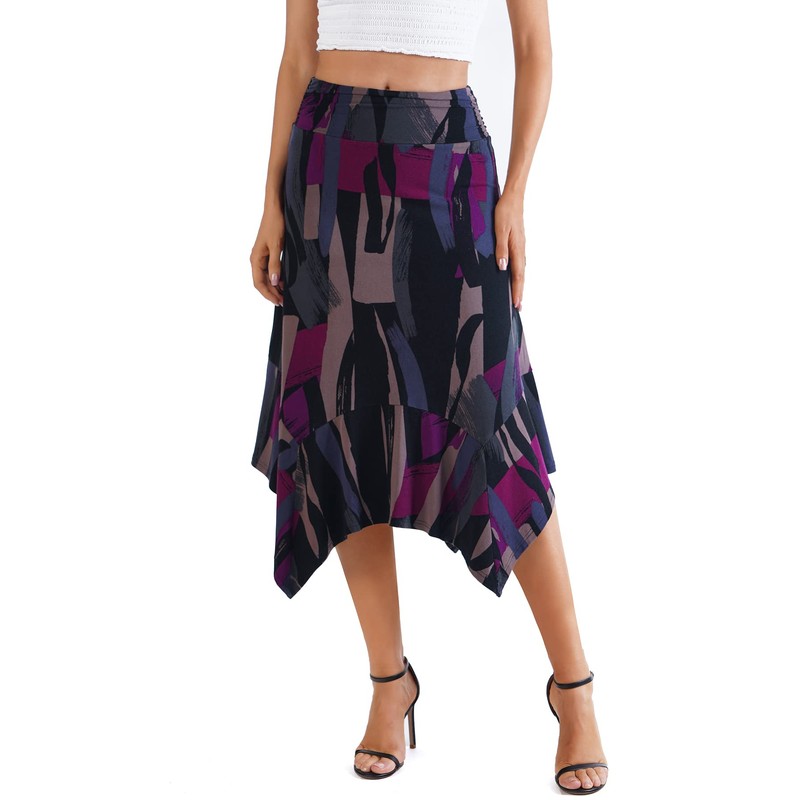 DJT Women's Ruched Elastic Waist Soft Flowy Handkerchief Hem Midi Swing Skirt XL Black Purple Painting